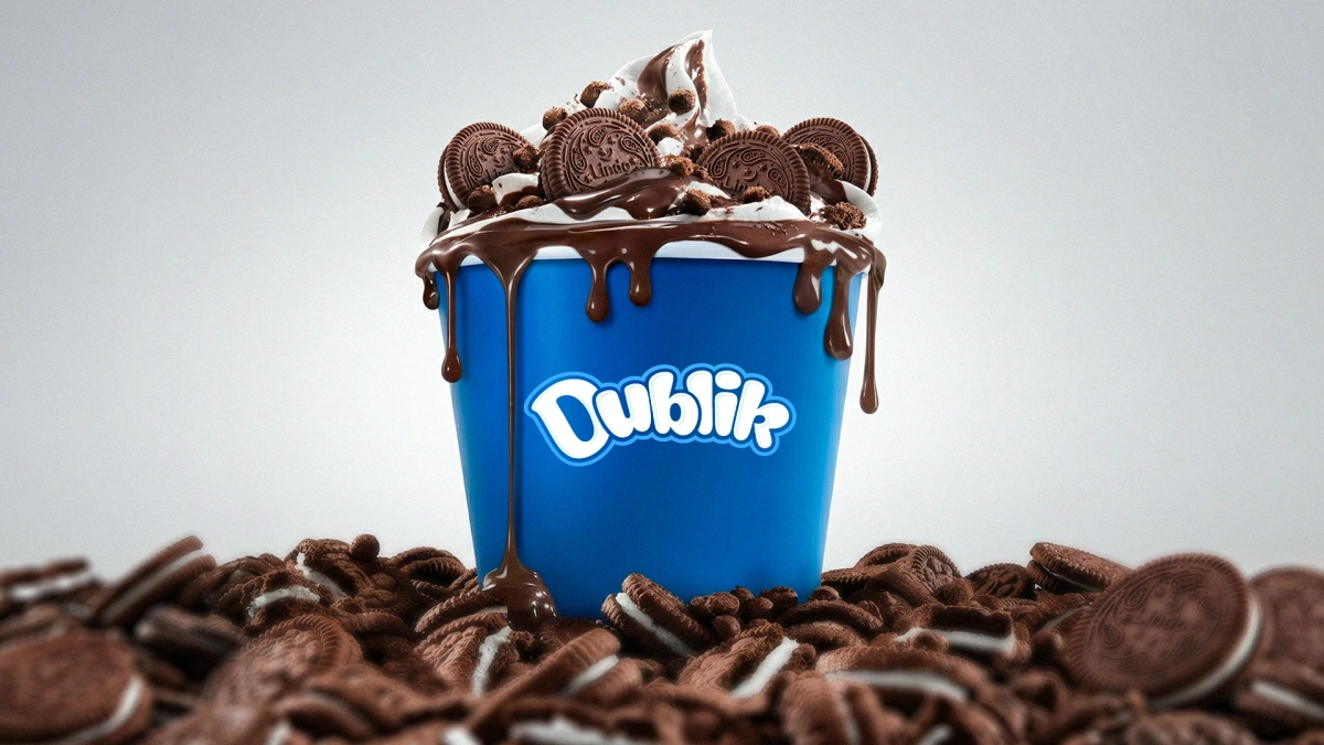 - Вербальная айдентика (нейминг): мы дали бренду имя «Dublik» (Дублик). Оно образовано от двух основ: «дубль» (отсылает к концепции двойного печенья) и уменьшительно-ласкательного суффикса «-ик». Название звучит тепло, легко произносится и задает дружелюбный тон коммуникации бренда (Tone of Voice).
