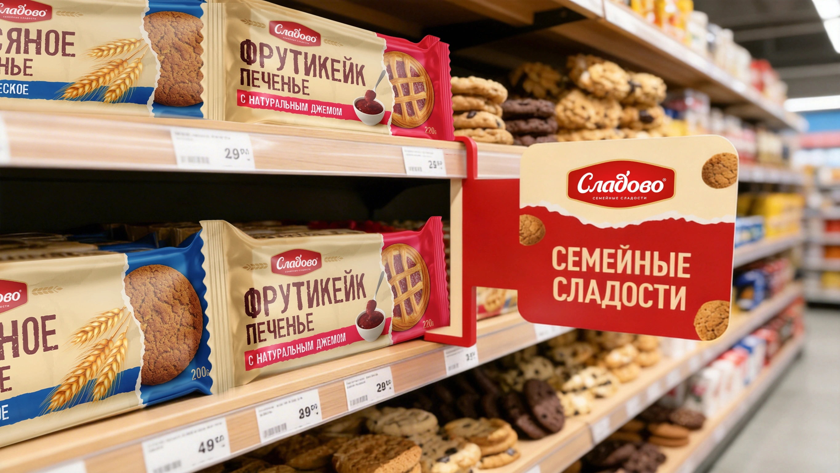 - Дизайнерская хитрость: обратите внимание на рендеры — в каждой упаковке мы применили особый визуальный прием. Создается иллюзия надорванной обертки, сквозь которую проглядывает аппетитное, реалистичное печенье (например, «Фрутикейк» с насыщенным джемом или яркие «Миндальки»). Это решение с лихвой закрыло боль клиента из разряда «продукт должен быть виден». Теперь покупатель видит печенье не через скучный прозрачный пластик, а через «вкусный» и креативный дизайн.